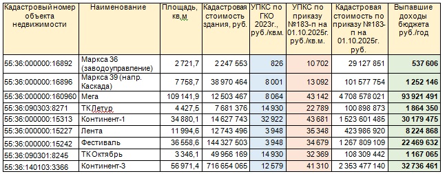 В приказе Министерства имущественных отношений Омской области установлены 17 объектов, с кадастровой стоимостью свыше 300 млн. руб., однако в случае организации работ по объективной кадастровой оценке количество таких объектов вырастет более 7, а поступления в бюджет по налогу на имущество от данных объектов превысит 2 млрд. рублей.