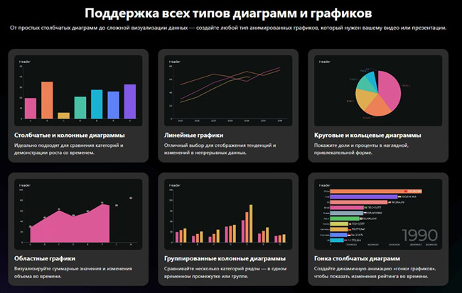 Тут будет представлена библиотека анимаций для диаграмм (столбчатых, круговые, линейных и других). Пользователю нужно выбрать тот тип, который больше всего подходит для его данных.
