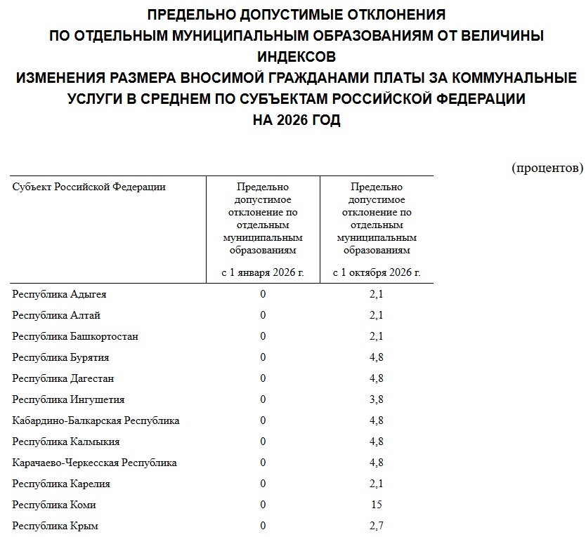 В скобках первое число – индекс изменения размера вносимой гражданами платы за коммунальные услуги в среднем по субъекту РФ на 2026 год, второе – предельно допустимое отклонение по отдельным муниципальным образованиям от величины индексов изменения размера вносимой гражданами платы за коммунальные услуги в среднем по субъекту РФ на 2026 год.