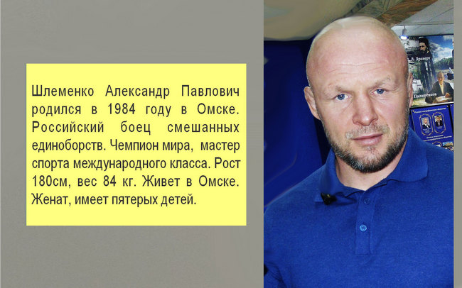 Справка. Александр Павлович ШЛЕМЕНКО родился 20 мая 1984 года в Омске. Российский боец смешанного стиля (ММА), представитель средней весовой категории. Выступает на профессиональном уровне с 2004 года. Он наиболее известен участием в турнирах американской организации Bellator MMA, состоял в ней практически со времён её становления, одержал здесь 12 побед. Дважды выигрывал гран-при Bellator, владеет титулом чемпиона Bellator, который сумел защитить трижды. За свою долгую спортивную карьеру ШЛЕМЕНКО выступал и во многих бойцовских промоушенах в том числе М-1 Global, League S-70, Fight Nights, RCC, SFL, ShoXC, Junle Fighe, входил в число сильнейших бойцов мира средней весовой категории. Чемпион мира по современному панкратиону, чемпион Азии, чемпион России, обладатель Кубка России по панкратиону. Имеет звание мастера спорта международного класса по армейскому рукопашному бою. Исповедует крайне агрессивный стиль, наносит большое количество силовых ударов и всегда стремится нокаутировать соперника. Его характерная черта – это частое применение ударов с разворота, особенно эффективны в его исполнении удары руками «бэкфисты». В общей сложности выиграл среди профессионалов более шестидесяти боёв, подавляющее большинство побед оформил досрочно. Возглавляет в Омске авторскую школу боевых искусств «Шторм». Он последователь здорового образа жизни и ярый борец с нарастающей алкоголизацией в стране.