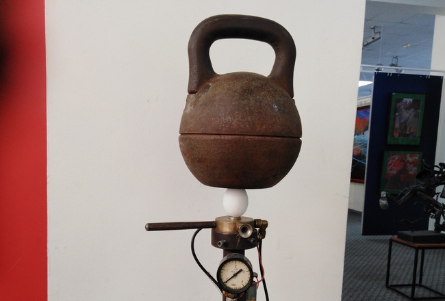 Особое внимание и любопытство вызывает объект Владимира НОВИКОВА «Формула любви»: огромная гиря держится на настоящем яйце. Конечно, там есть какая-то хитрость, но автор не делится секретом этого фокуса. Зато охотно рассказывает о концепции: