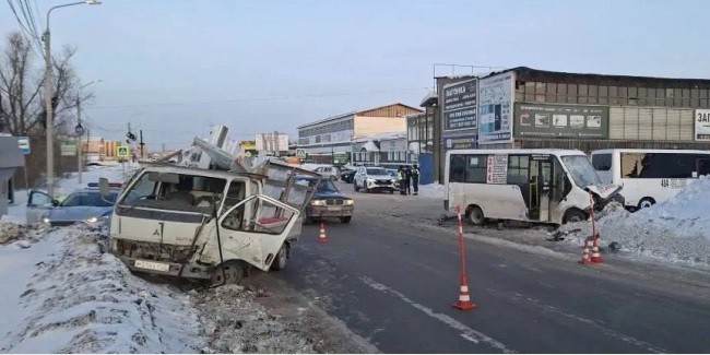 Следственно-оперативная группа омской полиции 13 февраля осмотрела место ДТП (на фото) в районе строения №97 по улице Семиреченской. Полицейскими предварительно установлено: 58-летний водитель минигрузовика Mitsubishi около 16:20 при развороте не пропустил попутный микроавтобус «ГАЗель» и допустил с ним столкновение.