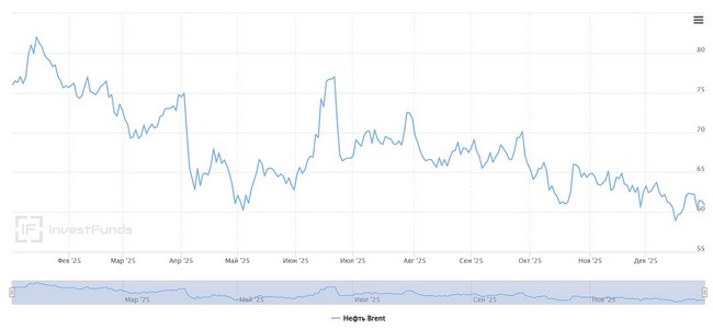 Но криптовалюты криптовалютами, а что-то вечно для России – и это, конечно, нефть. За 2025 год нефть марки Brent упала с 75 долларов США до 60 долларов – минимума с 2022 года. Сказалось как снижение геополитической напряженности, так и увеличение добычи странами ОПЕК+. Картель увеличил квоты по добыче более чем на 2,8 млн баррелей в сутки, основываясь на позитивном прогнозе по спросу на нефть в 2026 году, несмотря на то, что прогнозы Управления энергетической информации США говорят о профиците нефти и нефтепродуктов.