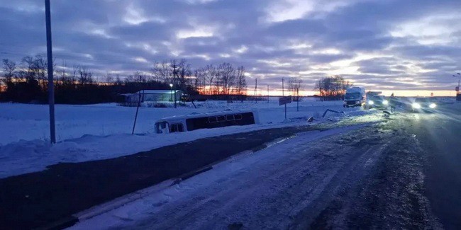 Следственно-оперативная группа ОМВД по Калачинскому району вечером 19 февраля осмотрела место ДТП (на фото) на 7-м километре трассы Калачинск – Ивановка – Кабанье. Полицейскими предварительно установлено: 32-летняя женщина – водитель автомобиля Mazda около 18:20 при выезде со второстепенной дороги врезалась в автобус ПАЗ маршрута «Калачинск – Ивановка» с 17 пассажирами. От удара рейсовый автобус отлетел в кювет.