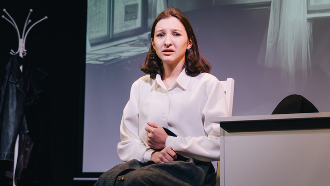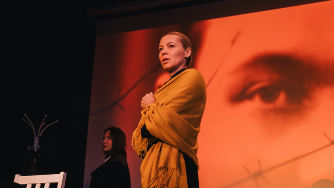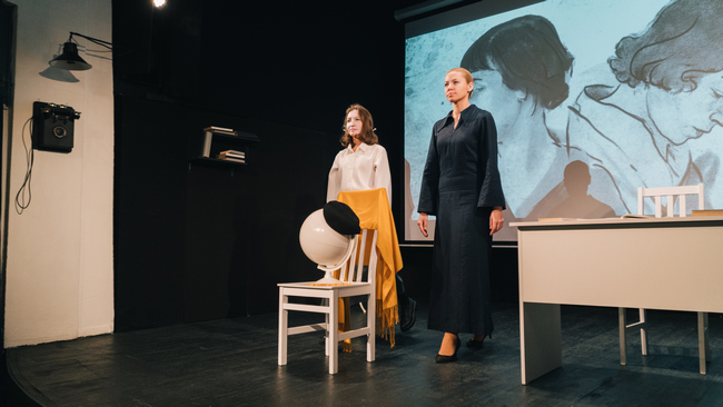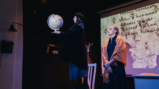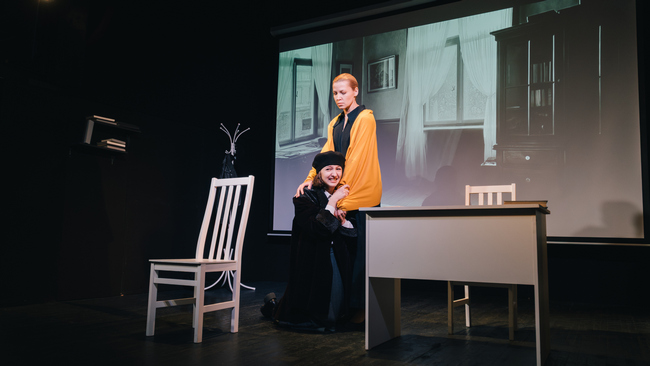 Видеоряд удачно дополняет скромное внешнее оформление (художник Алиса ГУЛКАНЯН). Каждая из актрис играет тут две роли – нашу современницу и одну из поэтесс. Нет ни особого грима, ни портретного сходства. Лишь исполнительница ролей Даши и Марины Цветаевой меняет бейсболку и куртку на изящное пальтецо и берет в стиле 1930-х, которые предусмотрительно висят на вешалке. Переключение из образа в образ происходит несколько раз и происходит мгновенно. Это напоминает кинематографический прием, только в кино подобное достигается путем монтажа, здесь же актрисам действительно приходится перестраиваться моментально. И, конечно, молодой актрисе это дается сложнее, чем ее опытной партнерше. Иногда она и излишне педалирует эмоции. Вообще, Цветаева в исполнении Екатерины УХОВОЙ кажется восторженной девочкой, а Ахматова рядом с ней выглядит той же «учительницей». Между тем, Анна Андреевна и Марина Ивановна были почти ровесницами и обеим было уже по пятьдесят. Но, может быть, таким образом показывается внутренняя суть Цветаевой, ее хрупкость, импульсивность, неприспособленность к жизни. В Ахматовой чувствуется крепкий внутренний стержень, который, наверное, и помог ей выжить. Кстати, их встреча состоялась в июне 1941 года, незадолго до начала войны – еще одного испытания, которое Цветаева уже не вынесет…