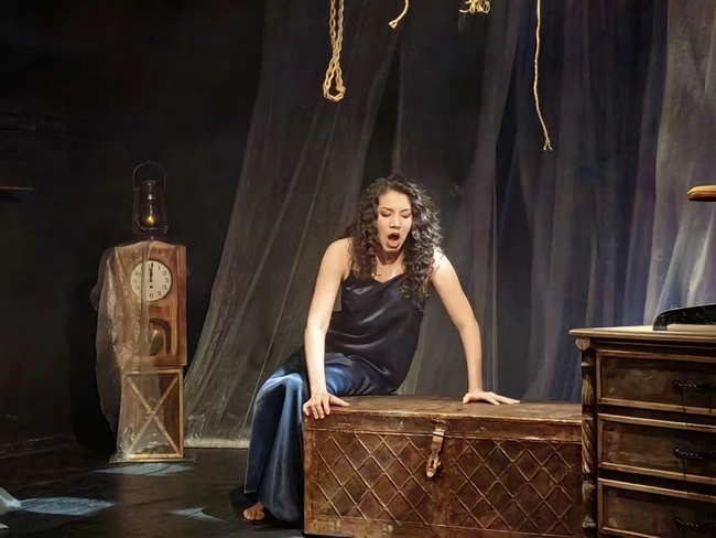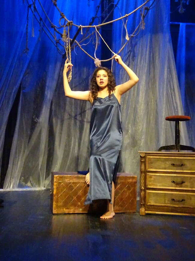 Сценография Лианы ПРОХОРОВОЙ не только функциональна, но, можно сказать, многофункциональна. Причудливо завязанные веревки, свисающие с колосников, поначалу кажутся атрибутом языческих ритуалов, а чуть позже – становятся обозначением корабельного снаряжения. Часы символизируют время, его безжалостность ко всему, особенно к тому, что называется женским естеством. Вместе с другими предметами мебели, несущими приметы стиля модерн, они составляют островок, как будто выплывающий из цветаевской эпохи, может быть, даже из ее кабинета на границе морока и сна.