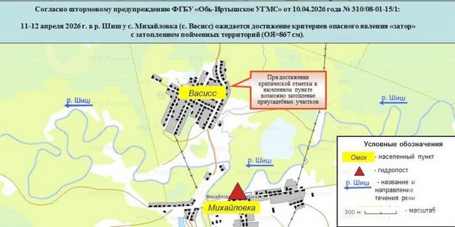 ГУ МЧС по Омской области объявило на ближайшие выходные, 11–12 апреля, экстренное предупреждение об опасном природном явлении. Гидрологи Обь-Иртышского УГМС прогнозируют, что уровень реки Шиш у сёл Михайловка и Васисс в Тарском районе достигнет опасного критерия (867 см) и вода затопит пойменные территории – прилегающие к реке участки земли. Причиной этого станет затор – скопление льдин в русле, образовавшееся во время ледохода.