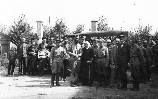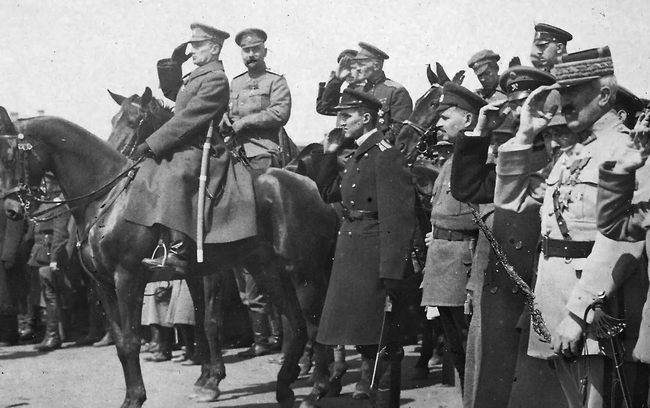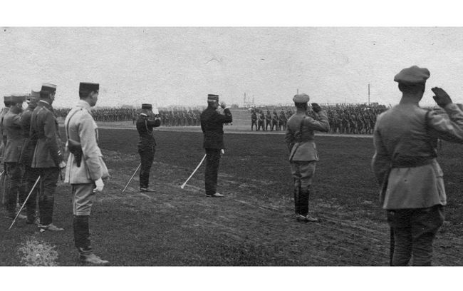 «На фото видим со спины французского дивизионного генерала, главу французской военной миссии генерала М. Жанена. Он принимает парад Чехословацкого корпуса».