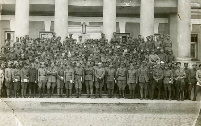 «Так, с начала августа 1919 года в здании кадетского корпуса находилось Первое артиллерийское училище. Также часть помещений кадетского корпуса использовалась под госпиталь для чехословацких легионеров. На снимке – чехословацкие легионеры на крыльце кадетского корпуса. Также учебные классы занимала колчаковская контрразведка».