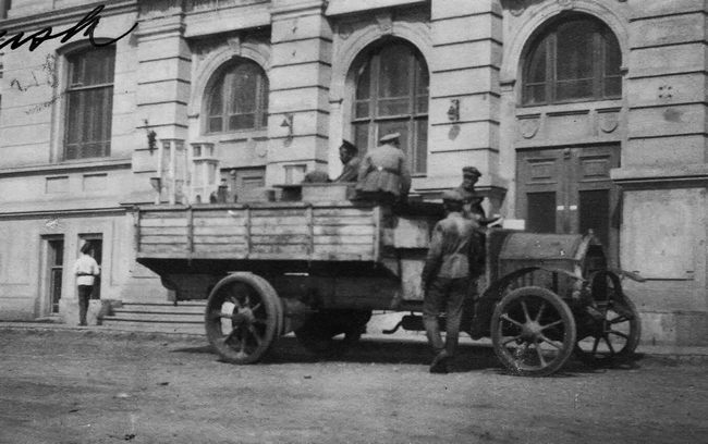 На последних двух стендах – фотографии из омской повседневной жизни. В частности, грузовик у здания Коммерческого училища (ныне улица Партизанская). Летом 1918 года часть здания училища занимало Министерство труда колчаковского правительства.