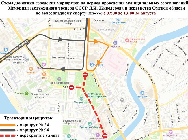 24 августа в Омске будет проводиться Мемориал заслуженного тренера СССР Л.И. Живодерова и первенство Омской области по велосипедному спорту. Как сообщает департамент транспорта администрации города Омска, в период с 7:00 до 13:00 часов будет закрыто движения транспорта по улице Ленина на участке от улицы Тарской до площади Победы, по улице Герцена на участке от улицы Интернациональной до улицы Ленина, включая площадь Победы.