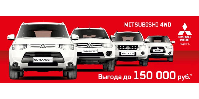 В течение ноября действует специальное предложение на покупку автомобилей Mitsubishi ASX, Mitsubishi Outlander, Mitsubishi Pajero Sport или Mitsubishi Pajero с выгодой до 150 тысяч рублей!
