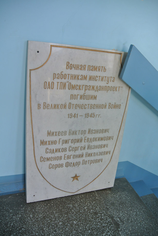 Обязательно, каждое 8 мая, ровно в полдень будут собираться причастные к истории Омскгражданпроекта, чтобы почтить память своих последних сотрудников, погибших в прошлые сороковые. Вот их имена: Михеев Виктор Иванович – инженер-сантехник, Михно Григорий Евдокимович – водитель, Садиков Сергей Иванович – конструктор, Семёнов Евгений Николаевич – архитектор, Серов Федор Петрович – инженер-сметчик.