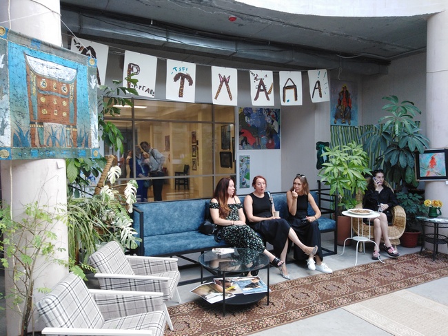 Пространство гостиной-галереи действительно просторное и светлое, с прозрачным потолком-куполом, винтажной мебелью, фотозонами и уголками для отдыха. Работы расположены не в строгой развеске, а словно именно в гостиной уютного дома.