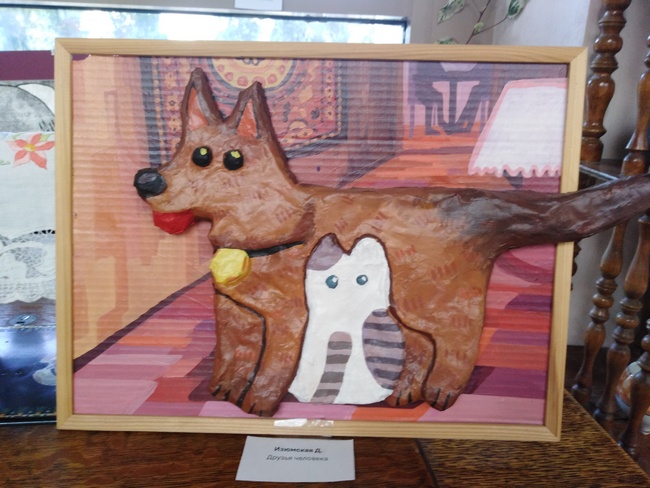 Тема работ, естественно, анималистическая. На картинах, открытках, в декоративной пластике – кошки и собаки, лошади и козы, даже попугай и енот.