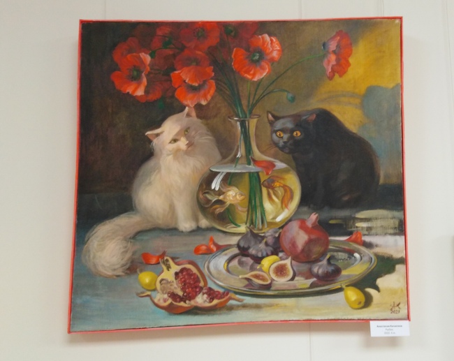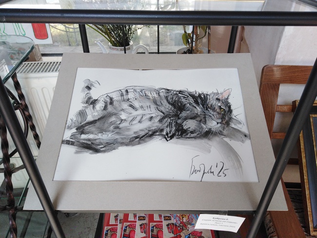 Участвует в выставке и председатель Омского отделения Союза художников России Андрей МАШАНОВ. Серию работ с котиками делал специально к мероприятию, экспериментировал с новым материалом – чернилами. А так тема ему тоже близка.