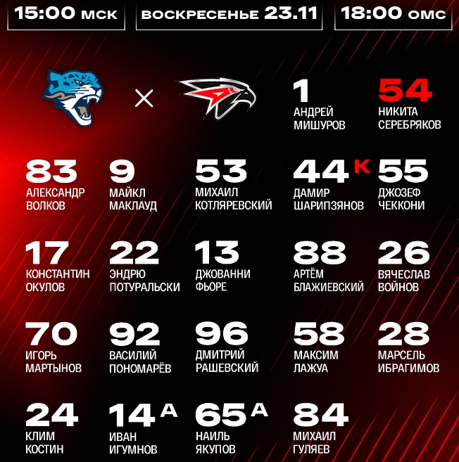 В Астане 23 ноября хоккеисты «Барыса» (29 игр, 27 очков, 8-е место на «Востоке») проиграли «Авангарду» (27 игр, 37 очков, 3-е место на «Востоке») со счётом 2:5 (0:1, 1:4, 1:0).