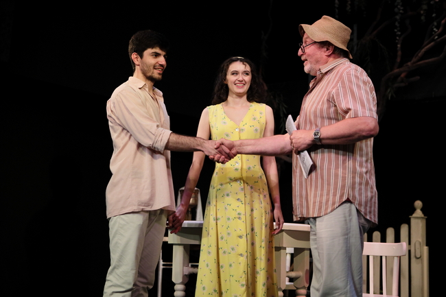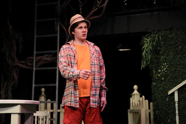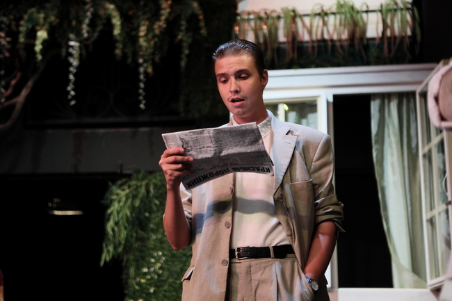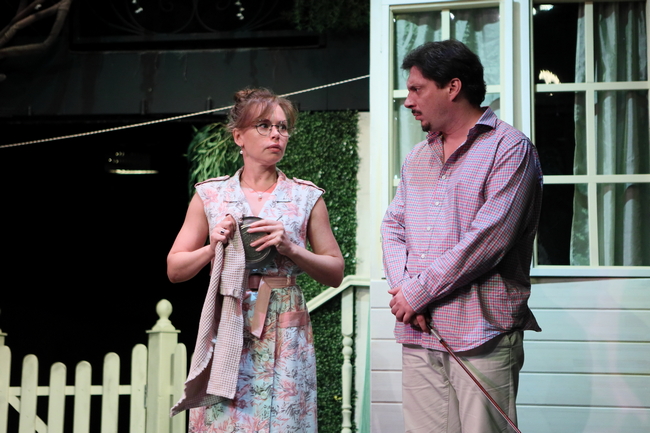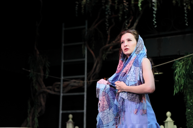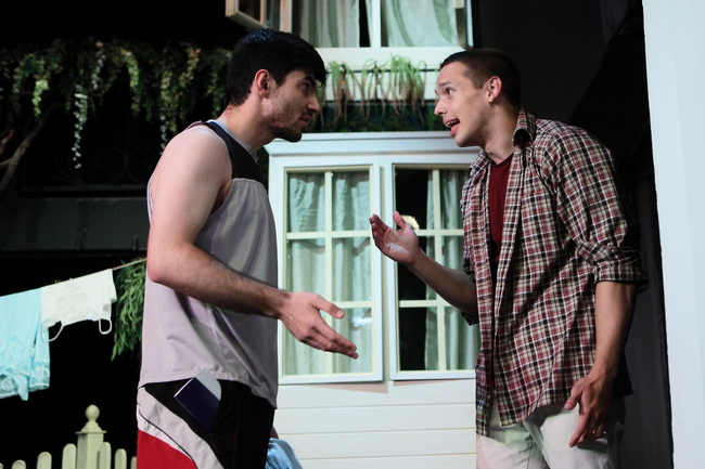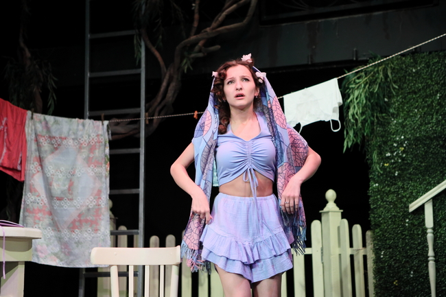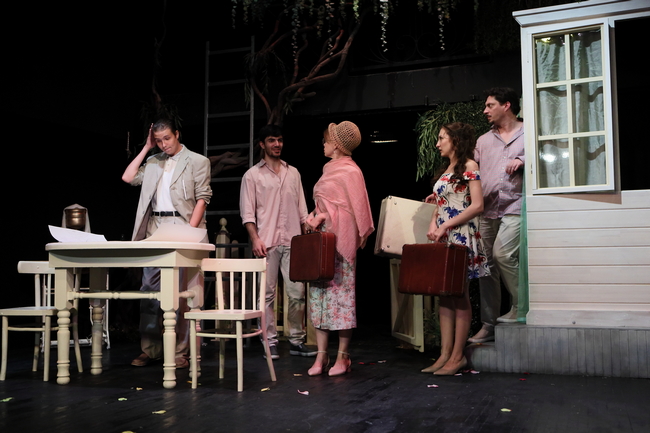 На сцене садовый столик, умывальник (правда, почему-то без воды), развешенное на веревке белье, калитка в зарослях зелени. Из таких знакомых всем мелочей художник-постановщик Лиана ПРОХОРОВА собирает картинку уютного быта. В углу выстроен фрагмент дачи с верандой и окном на втором этаже, что позволяет создать двухуровневую игровую площадку.