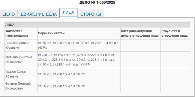 Судья Кировского райсуда Дмитрий ЛИТВИНОВ принял к производству уголовное дело №1-366/2025 в отношении Дмитрия МЕЛЬНИКА и его помощников. Следователь полиции инкриминирует четырём омичам покушение на незаконный сбыт наркотических средств (ч.3 ст.30 – чч.3–4 ст.228.1 УК РФ). А организатору преступной группы также вменяют незаконное приобретение наркотиков в крупном размере (ч.2 ст.228 УК РФ) и легализацию (отмывание) денежных средств, приобрётенных в результате совершения преступлений (ч.1 ст.174.1 УК РФ).