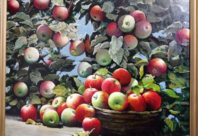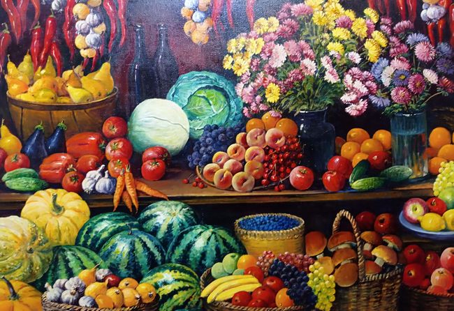 Напротив, взрывом цвета становятся натюрморты: «Дары природы», «Яблочный Спас», «Гроздья красной рябины», «Царство Флоры», где подробно выписан каждый фрукт или овощ, каждый цветок. При этом натюрморты СОЛОДУХИН создает по памяти.