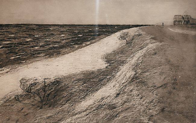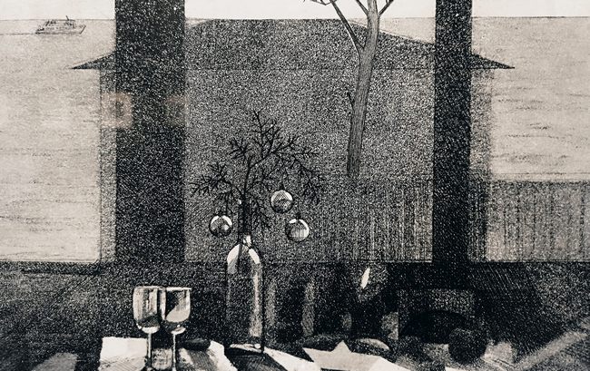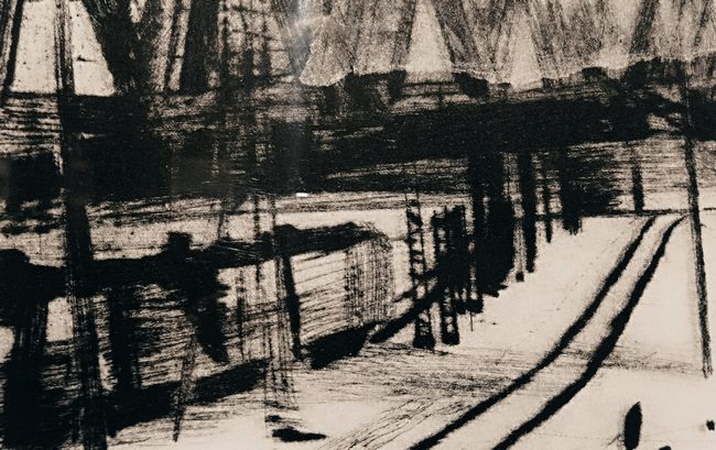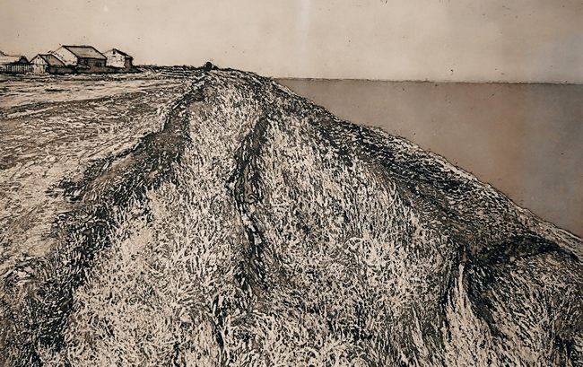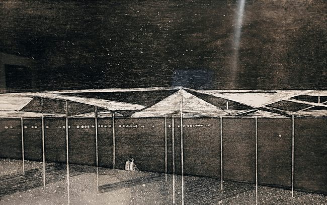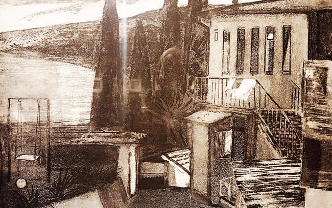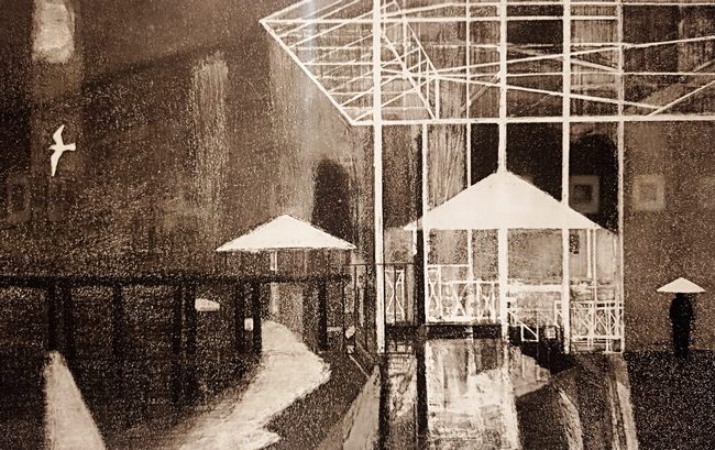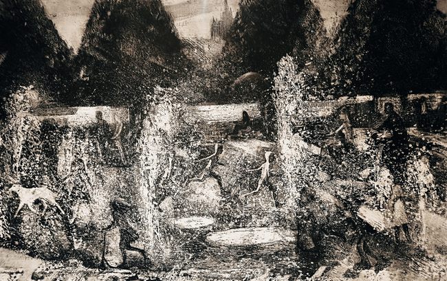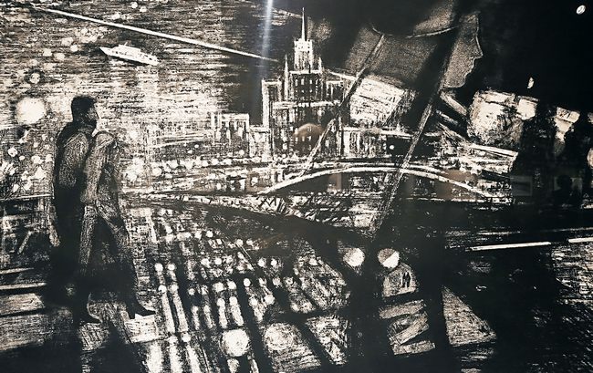– Вот это – набережная возле здания Новой Третьяковки, – показывает Мария. – Там происходит очень активная жизнь: брызжут фонтаны, бегают дети, ездят люди на самокатах, и все это создает такой шум города. Я много лет ходила туда со студентами на пленэры, наблюдала, мне хотелось как-то для себя сохранить именно это ощущение. И от первоначального замысла до воплощения прошло три года. В этом листе у меня практически соединились все офортные техники. Чтобы получить эти брызги, мне пришлось сделать резерваж: это когда тушь разводится со специальным сахаром, потом делается рисунок на доске, высушивается, затем покрывается тонким слоем кислотоупорного лака. После этого я кладу доску в кипяток, тушь «взрывается», срывает пленку лака, и получается рисунок, который уже можно засыпать акватинтом и дальше травить.