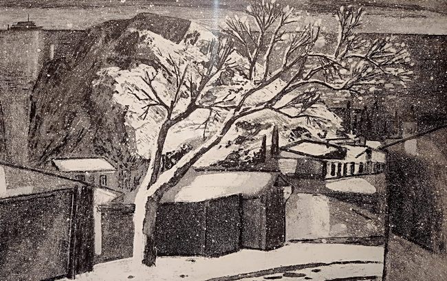 Тема дороги вообще важна для творчества Марии СМОЛЬЯНИНОВОЙ. Эта тема ярко проявляется, например, в работе «Зима», где мы видим железнодорожные пути, словно расчерчивающие снег, крыши пристанционных домиков и, кажется, даже слышим гудки паровозов.