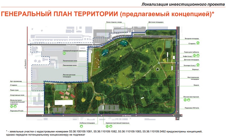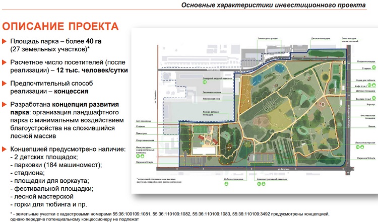 Территория парка была включена в инвестиционную карту РФ, а также в перечень приоритетных инвестиционных ниш в сфере туризма и рекреации, в том числе для реализации проекта городских глэмпингов. По итогам совещания в правительстве Омской области было принято решение о развитии парка на основе концессионного соглашения, где концедентом выступит муниципалитет.