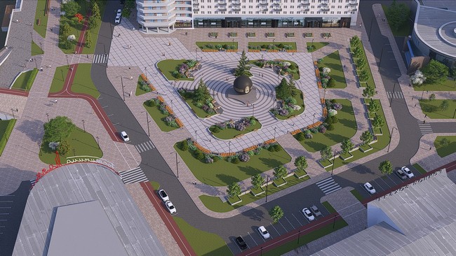 СЕРГЕЕВ представил свои предложения: велопешеходный мост через Омь, «подхватывающий пешеходные потоки с разных уровней и собирающих их воедино на отметку, необходимую для пассажирских прогулочных судов», видовой амфитеатр с обзором на шар Бухгольца, пятиугольные прогулочные пространства, отсылающие к геометрии первой Омской крепости, зоны отдыха с лавками, интегрированными в геопластические композиции. Как опциональный вопрос обозначена автомобильная связка вдоль особняка купца Батюшкина. По периметру площади добавлено озеленение, внутри примерно на 30% перераспределено положение газонов. Автор концепции подчеркнул, что необходимо сохранить хвойные деревья вокруг памятника «Держава», а мощение из натурального камня с декоративной раскладкой минимизировать: площадь должна сохранить рекреационно-мемориальную функцию (рассматривать барельефы шара можно и нужно вблизи), а не становиться «монументальной».