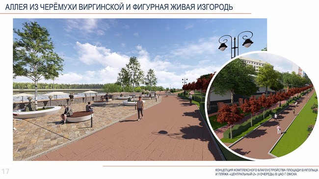 Вторую концепцию презентовала начальник сектора питомника БУ г. Омска «УДХБ» Яна БАХТА. Она, как и СЕРГЕЕВ, сохранила взрослые хвойные деревья вокруг памятника, а также отделила цепью кленов жилой дом от площади, но добавила в проект березы, как символ омских лесов, подчеркнутые чугунными решетками и акцентным мощением, архитектурные формы для защиты зеленых насаждений (приподнятые грядки и габионы). Для укрепления берега БАХТА предложила организовать биоплато с влаголюбивыми растениями (белокопытник, дербенник). По периметру площади запроектирована велодорожка, на пляже вдоль променада – восемь качелей, детская площадка «натуральных» цветов и теневые навесы с интегрированными скамьями. Контрастное мощение красным и белым гранитом отсылает, по задумке автора, к слиянию рек Иртыша и Оми, а скамьи из бруса с кованными окладами и инсталляция «факел» напоминают об освоении Сибири. Шар Бухгольца поднят на сорокасантиметровый пьедестал:
