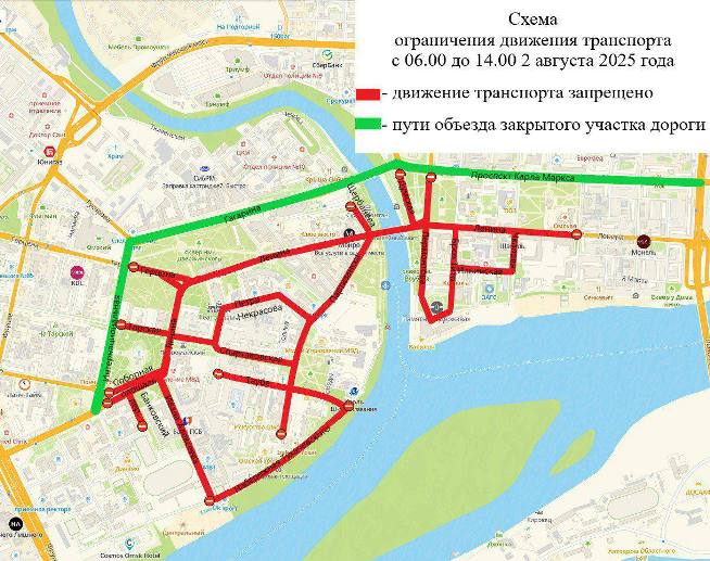 Также с 6:00 до 14:00 2 августа для транспорта будут закрыты Набережная Тухачевского на участке от улицы Таубе до улицы Кемеровской; улица Кемеровская на участке от Набережной Тухачевского до улицы Волочаевской; улица Ленина на участке от улицы Лермонтова до Ленинградской площади; улица Лермонтова на участке от проспекта К. Маркса до площади Бухгольца; улица Б. Тито на участке от площади Бухгольца до дома № 4 по проспекту К. Маркса, включая площадь Бухгольца; улица Чкалова на участке от улицы Ильинской до улицы Ленина; улица Короленко на участке от проспекта К. Маркса до улицы Комиссаровской; Иртышская набережная на участке от Ленинградской площади до улицы Шаумяна; улица Шаумяна на участке от улицы 9-й Ленинской до улицы 12-й Пролетарской; автодорога на участке от улицы Ленина до Иртышской набережной в районе дома № 1 по Ленинградской площади; автодорога на участке от улицы Ленина до Иртышской набережной в районе дома № 2 по Ленинградской площади; улица Циолковского на участке от проспекта К. Маркса до Иртышской набережной.