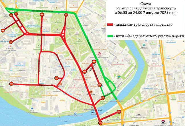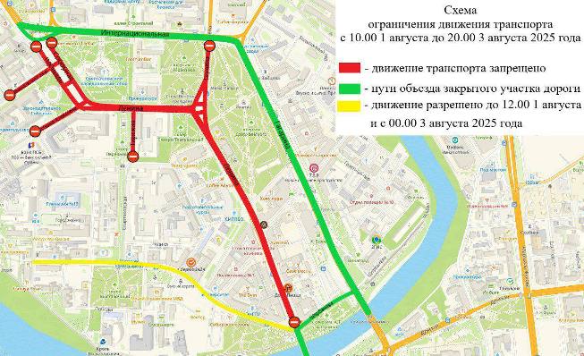 С 10:00 1 августа до 20:00 3 августа проезд будет невозможен по улице Ленина на участке от улицы Интернациональной до улицы Партизанской, включая Соборную площадь; улице Герцена на участке от улицы Интернациональной до улицы Ленина, включая площадь Победы; по Банковскому переулку на участке от Соборной площади до улицы Певцова; по улице Ивана Алексеева на участке от Соборной площади до улицы Красина; по улице Тарской на участке от улицы Ленина до улицы Красина.