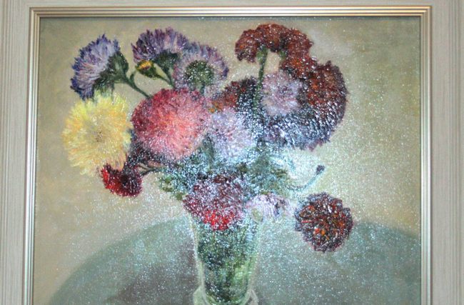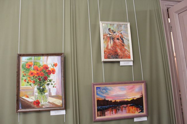 На выставке представлено 38 работ. Очень хорошие натюрморты («Маки» землеустроителя Натальи АНТОНОВОЙ, «Последние астры» Нины ЖУРАВЛЕВОЙ), старательные пейзажи – они есть почти у каждого.