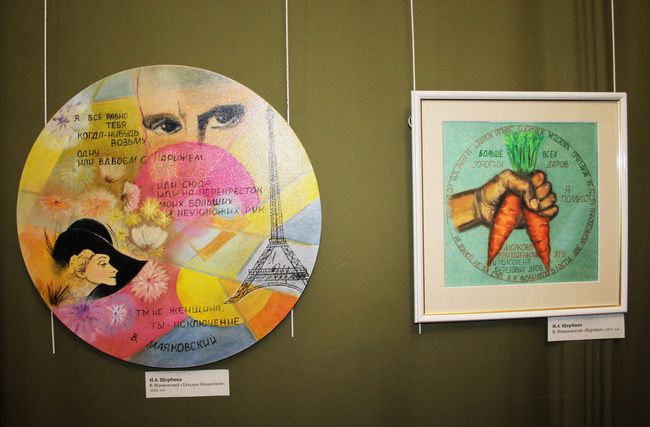 Но особое внимание привлекают работы Ирины ЩЕРБИНОЙ (врач по профессии, доцент ОмГМУ) из так называемой «литературной» серии, посвященные произведениям Владимира Маяковского «Хорошо!», «Послушайте!», «Татьяне Яковлевой». Они полуабстрактны, коллажны, многослойны и транслируют авангардный стиль, свойственный поэту.