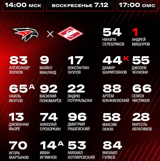 С трудом одолев уставшего аутсайдера «Сочи» на «G-Drive Арене» 7 декабря хоккеисты «Авангарда» (31 матч, 43 очка, 3-место на «Востоке», 8 — в КХЛ) обыграл московский «Спартак» (34 игры, 40 очков, 6-место на «Западе», 9 – в КХЛ) со счётом 7:5 (5:2, 1:1, 1:2).