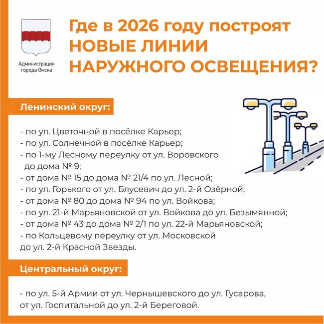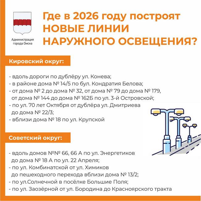 Тelegram-канал мэра Омска передаёт: в текущем году на установку новых опор и светильников направят 44,7 млн рублей. Линии наружного освещения планируется построить на 19 улицах Омска, из них пять – это переходящие объекты прошлого года.