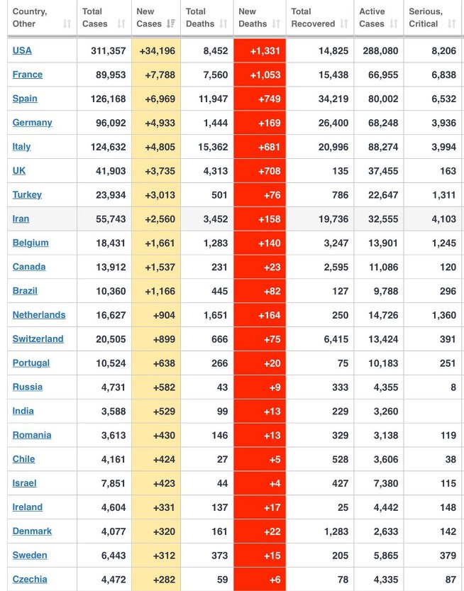 Сводка ВОЗ по миру за истекшие сутки (желтым — заболевшие за сутки, красным — умершие за сутки):