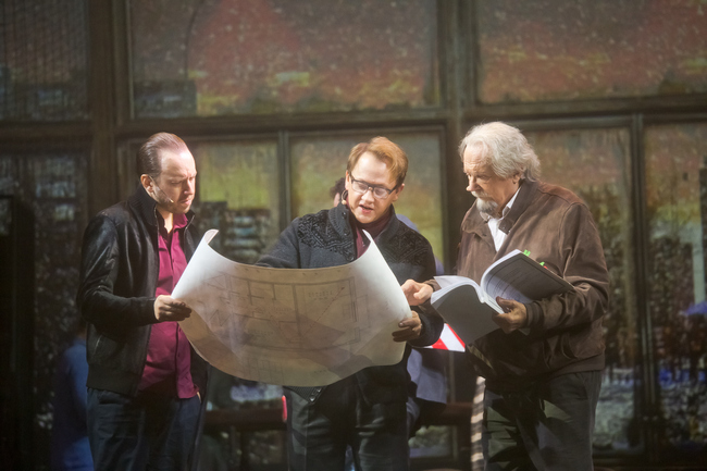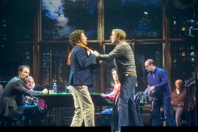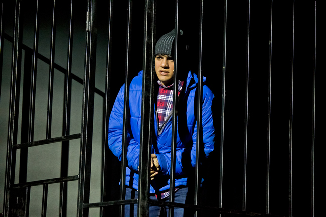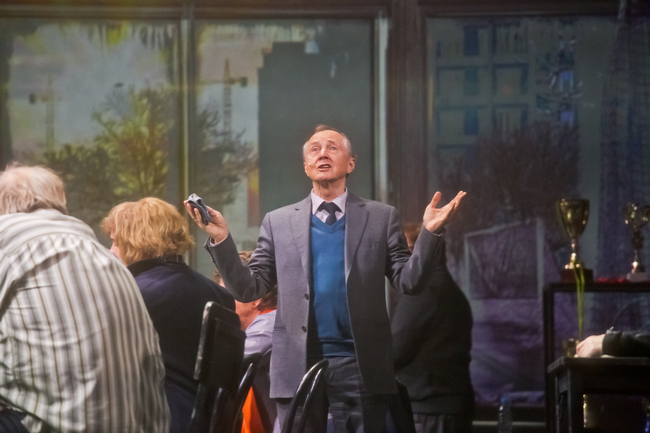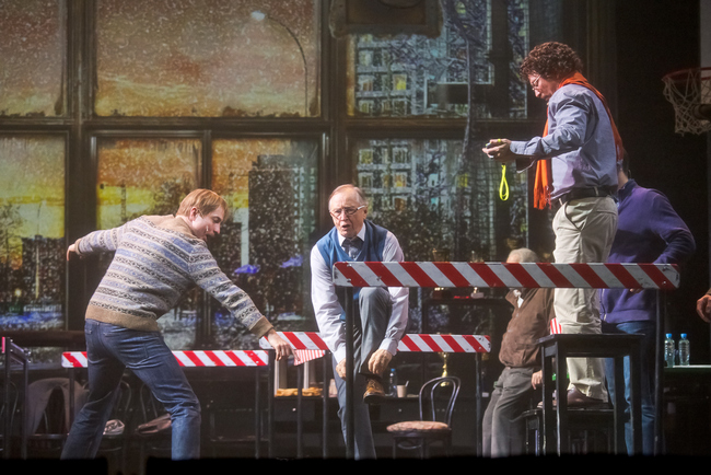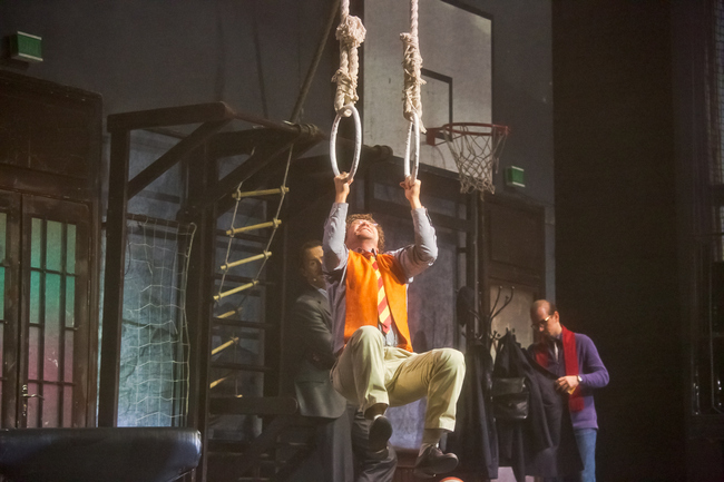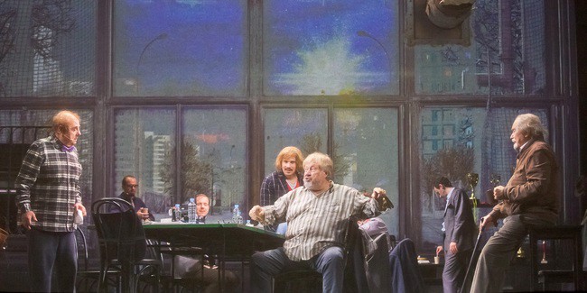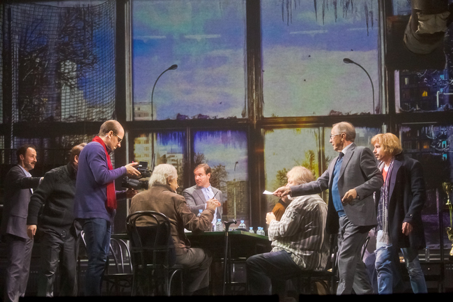 Заседание жюри присяжных происходит в школьном спортзале, так как в здании суда не оказалось совещательной комнаты. И художник-постановщик Юрий КУПЕР подробно выстраивает впечатляющее пространство в стиле лофт с огромным окном, за которым, кажется, в режиме реального времени проезжают трамваи и машины, проходят люди и день постепенно сменяется ночью. Это ощущение реального времени, наверное, самое ценное в спектакле.