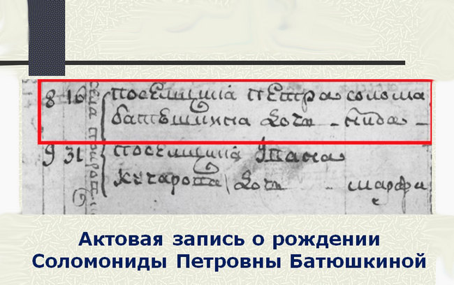 «Одной из главных находок стал документ XVIII века. Это актовая запись о рождении 10 августа 1791 года Соломониды – дочери Петра Батюшкина в посёлке Покрово-Иртышском (ныне одноимённая деревня в Омском районе). Что стало с этой девочкой? Как сложилась её жизнь? К сожалению, мне не удалось установить. Этот документ дает важные детали. Например, это самый старый документ, который подтверждает пребывание рода Батюшкиных на омской земле».