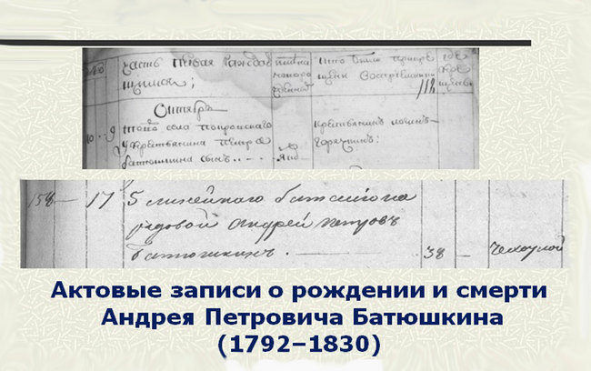 Также обнаружены актовые записи о рождении в 1792 году и смерти в 1830 году Андрея Петровича Батюшкина.