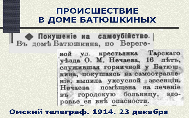 «С помощью коллег нашёл в омской прессе публикацию за декабрь 1914 года, где говорилось о том, что в доме Батюшкина служила 16-летняя горничная Нечаева. По неустановленной причине она решила покончить свою жизнь самоубийством. Она выпила уксус. Её незамедлительно доставили в больницу. Врачам удалось спасти Нечаеву. Почему девушка решилась на такой поступок, можно только догадываться, и версий может быть много. Здесь какие-то рассуждения будут излишни. И с ними можно согласиться, ведь никаких иных свидетельств об этом прецеденте в распоряжении историков нет».