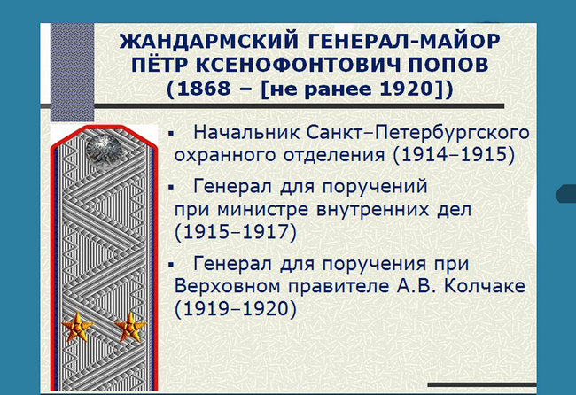«Генерал Пётр Попов служил в начале ХХ века в Отдельном корпусе жандармов в Петрограде. Он занимал должность начальника петербургской охранки. Затем генерал служил в Министре внутренних дел. Он расследовал убийство Григория Распутина. Пётр Попов – человек неординарный. Его биографию надо исследовать дополнительно. Пока в освещении его фигуры беру паузу».