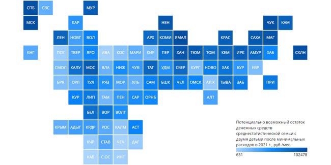 Среднероссийские показатели по итогам 2021 года заметно выше: у семьи с двумя детьми остаётся 50,3 тысячи рублей, у семьи с одним ребёнком – 61,6 тысячи. При этом между регионами наблюдается колоссальный разрыв в уровне жизни. Самые богатые семьи живут в Ямало-Ненецком автономном округе (102,5 тысячи рублей у семьи с двумя детьми и 115,5 тысячи рублей у семьи с двумя детьми), Москве (81 тысяча и 91,4 тысячи) и Санкт-Петербурге (77,1 тысячи и 87,2 тысячи). Беднейшими оказались семьи Кабардино-Балкарии (631 рубль и 14,8 тысячи рублей), Чечни (8,1 тысячи и 19,4 тысячи) и Ивановской области (10,3 тысячи и 21,1 тысячи).
