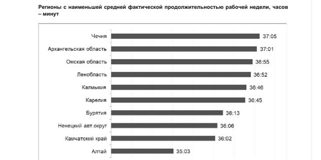 Наибольшая средняя фактическая продолжительность рабочей недели оказалась в Хакасии (40:01), Калужской области (40:00) и Владимирской области (39:49).