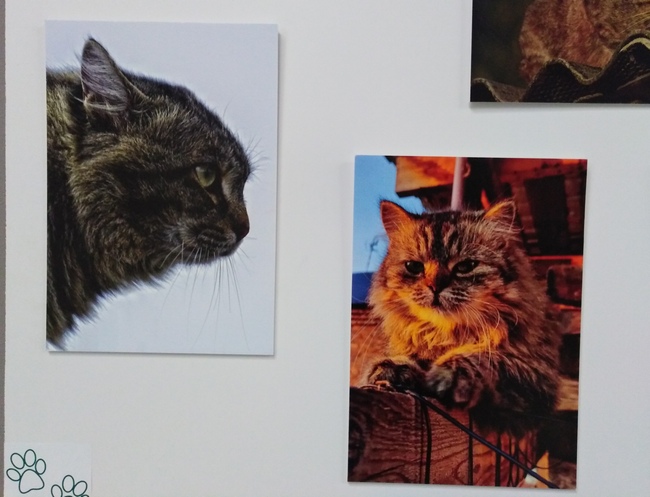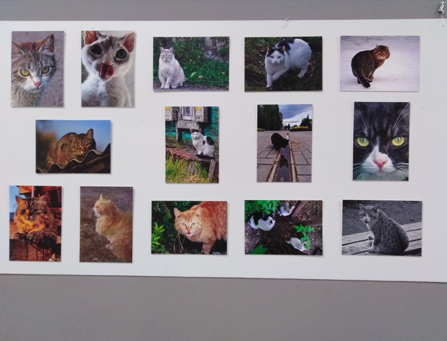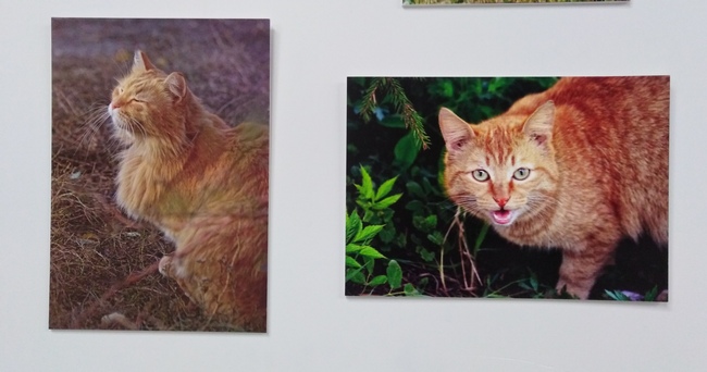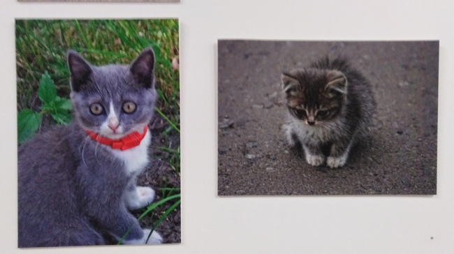 Самое печальное – смотреть на бездомных кошек. Красноречиво расположены рядом два снимка: хорошенького домашнего котенка в красном ошейнике и его неухоженного беспризорного собрата. А ведь попади тот в хорошие, заботливые руки, мог бы стать таким же красавцем. Поэтому выставка носит еще и благотворительный характер.