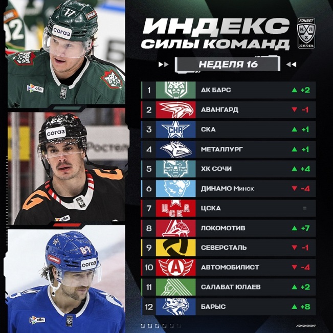 Омский «Авангард» (третье место на «Востоке») вечером 6 января в Казани выяснит свои отношения с местным «Ак Барсом» (второе место). Континентальная хоккейная лига сегодня опубликовала рейтинг «Индекс силы» по итогам 15-й недели регулярного чемпионата.