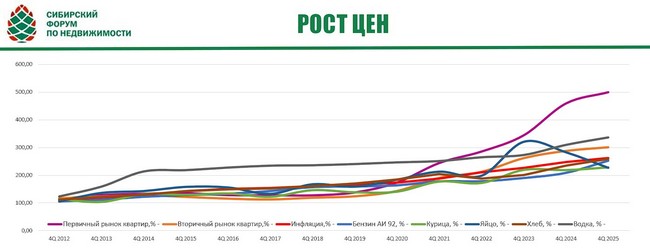 С учетом официальной инфляции за 2025 год 5,92%, рост цен на первичном рынке +8.8% опередил инфляцию, а на вторичном +4.6% – отстал. РЕПИН обратил внимание участников мероприятия на то, что скорость роста цен на квартиры на первичном рынке с пандемии наглядно опережает повышение стоимости всех других товаров в России (анализировались данные Росстата), к примеру, 92-го бензина, курятины, яиц, хлеба. А скорость роста цен на вторичку уступает лишь скорости удорожания водки: