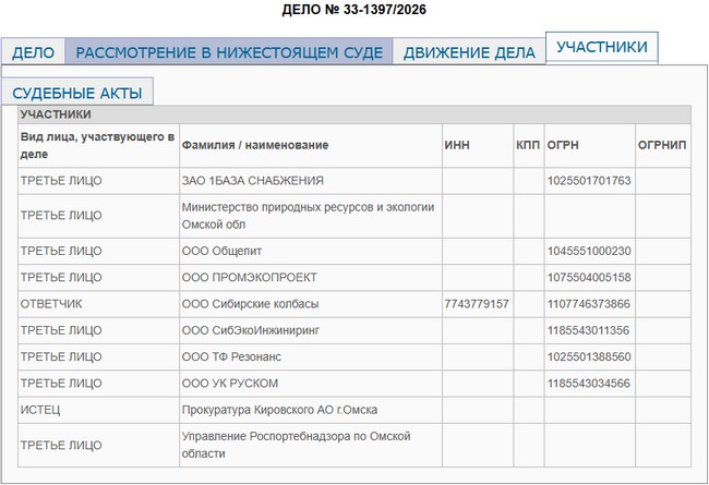 Коллегия Омского облсуда отменила решение Кировского райсуда от 19 ноября 2025 года по гражданскому делу №2-3908/2025 (апелляционное №33-1397/2026). Постановлено новое решение: ООО «Сибирские колбасы» обязано в течение 12 месяцев разработать проект санитарно-защитной зоны (СЗЗ) с учётом фактического количества источников выбросов, объёма загрязняющих веществ и увеличения валового выброса, а также получить положительное санитарно-эпидемиологическое заключение.