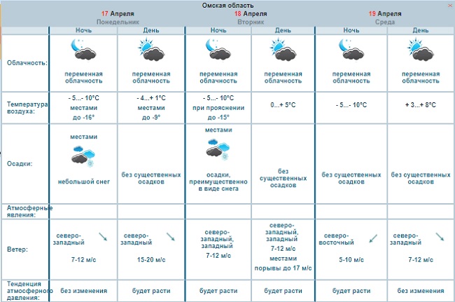 Спасатели объявили на 17 апреля штормовое предупреждение, ссылаясь на данные Обь-Иртышского управления по гидрометеорологии и мониторингу окружающей среды: ожидаются осадки преимущественно в виде мокрого снега и порывы ветра 15-20 м/с.