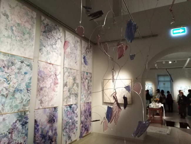 Свою выставку Наталья ПРОНИНА второй раз делает совместно с Лизой КОРН. Это ее бывшая студентка, дизайнер, и здесь она тоже отвечает за дизайн. Ее авторству принадлежат инсталляции, в том числе видео, и общее оформление пространства, которое погружает в атмосферу медитативного расслабления. Ты словно улетаешь в облака цветов.