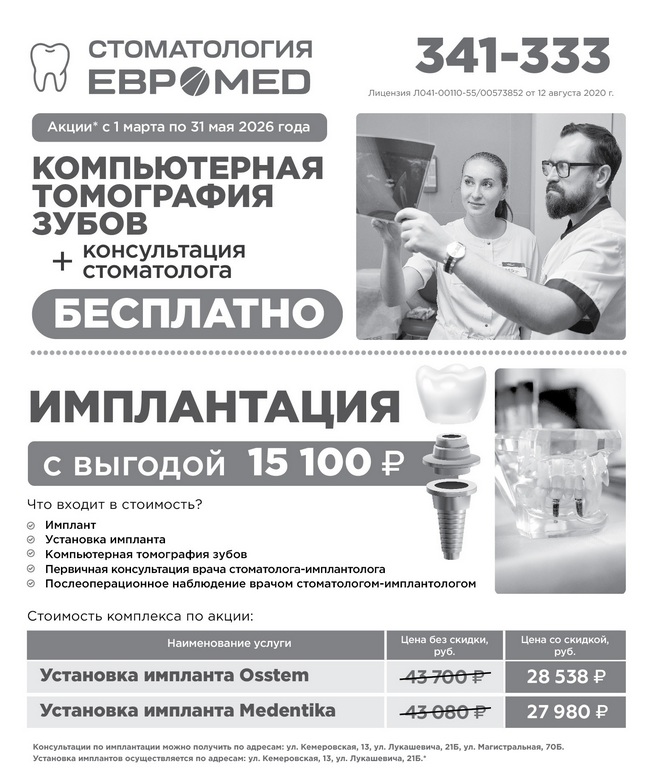 *Организатор акций ООО «МЦСМ «Евромед». Сроки акций с 01.03.26 по 31.05.26. Конусно-лучевую томографию (КЛКТ) зубов верхней и нижней челюстей можно пройти по адресам: ул. Кемеровская, 13, ул. Лукашевича, 21Б. Последующая консультация осуществляется по адресам: ул. Кемеровская, 13, ул. Лукашевича, 21Б, ул. Магистральная, 70Б. Организатор оставляет за собой право досрочно завершить акции или изменить правила их проведения при условии предварительного информирования пациентов через официальный сайт. Подробная информация об организаторе, сроках и условиях проведения акций у операторов справочной службы и на сайте euromed-omsk.ru.